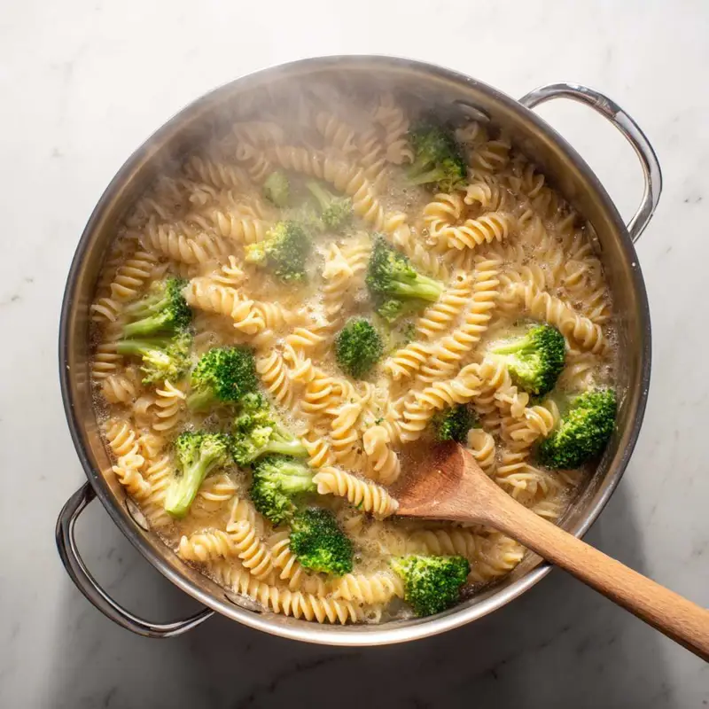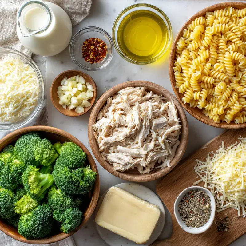 Bring a large pot of salted water to boil and cook penne pasta according to package directions until al dente. During the last 3 minutes of cooking time, add broccoli florets directly to the pasta water. Before draining, reserve 1 cup of starchy pasta water in a measuring cup. Drain pasta and broccoli together and set aside. Heat olive oil and butter in your largest skillet over medium-low heat. Cook diced onion for 4-5 minutes until softened, then add minced garlic for 30 seconds until fragrant. Pour in heavy cream and chicken broth, bringing mixture to a gentle simmer for 2-3 minutes. Look for small bubbles around the edges, not a rolling boil. Remove skillet from heat completely before adding cheese to prevent graininess. Whisk in Parmesan and mozzarella until completely smooth, then season with Italian seasoning, garlic powder, salt, pepper, and red pepper flakes. Add drained pasta and broccoli to the creamy sauce, tossing gently with tongs to coat everything evenly. Fold in shredded rotisserie chicken last. Add reserved pasta water 2 tablespoons at a time until you reach a creamy, glossy consistency. Stir in a cold knob of butter just before serving for restaurant-quality finish.