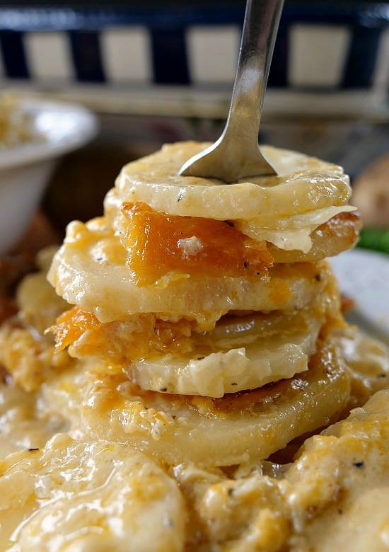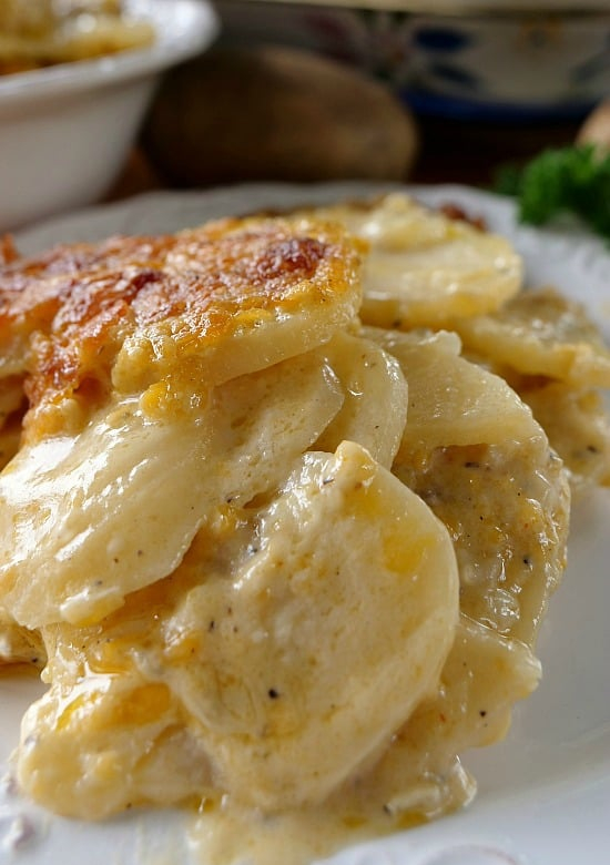 Scalloped potatoes are so good and these cheesy garlic scalloped potatoes are even better. Loaded with three different types of cheese, garlic and sour cream, these are definitely some tasty taters! Totally scrumptious. A delicious potato casserole that’s incredibly satisfying and filling. A great side dish, and with the holidays fast approaching, these cheesy garlic scalloped potatoes are perfect to serve with Thanksgiving dinner, Christmas dinner or with any dinner for that matter. Totally homemade from scratch, these creamy, cheesy potatoes are comfort food at it’s best. Imagine sinking your teeth into these soft, creamy, scalloped potatoes. Yum, yum! These scalloped potatoes are loaded with creamy, tender potatoes, 3 different cheeses and a cheese sauce that is absolutely scrumptious.