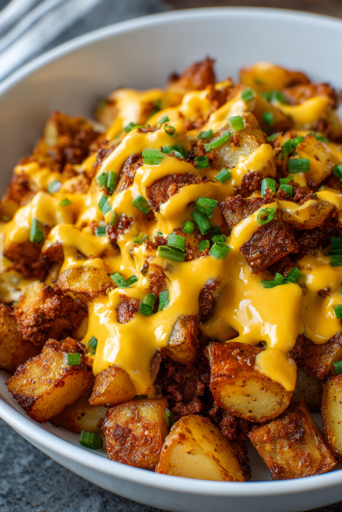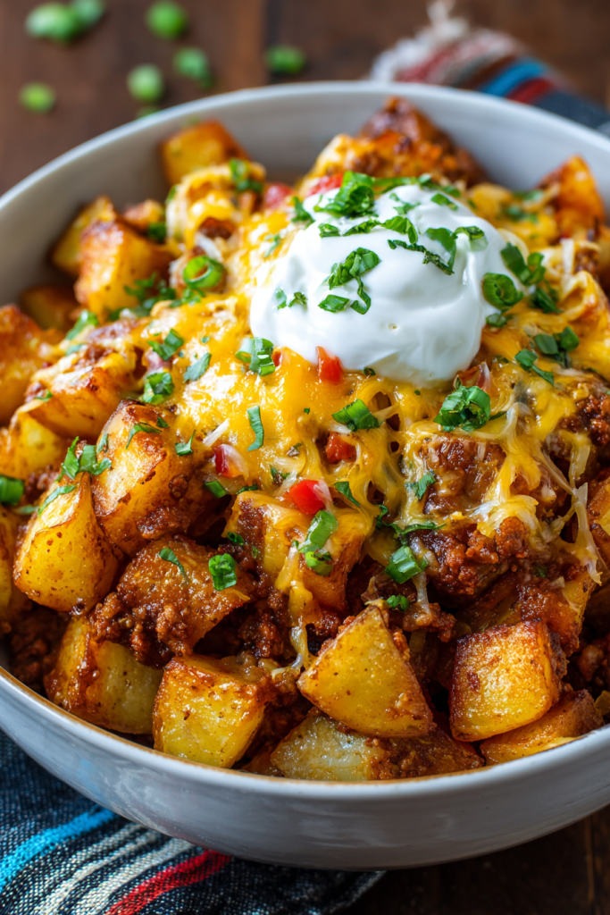 This Cheesy Taco Potatoes recipe is a hearty, flavor-packed dish—crispy potatoes topped with seasoned taco beef, gooey melted cheese, and your favorite toppings for a fun and easy dinner or party appetizer! If there’s one dish that never fails to bring everyone to the table, it’s a pan of warm, cheesy, flavor-packed comfort food. These Cheesy Taco Potatoes are exactly that—a recipe that combines tender, seasoned potatoes with taco-inspired ground beef, melty cheese, and all your favorite toppings. It’s hearty enough for dinner, crowd-friendly for game day, and simple enough to whip up on a weeknight.
