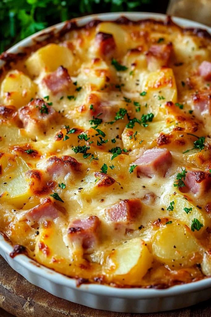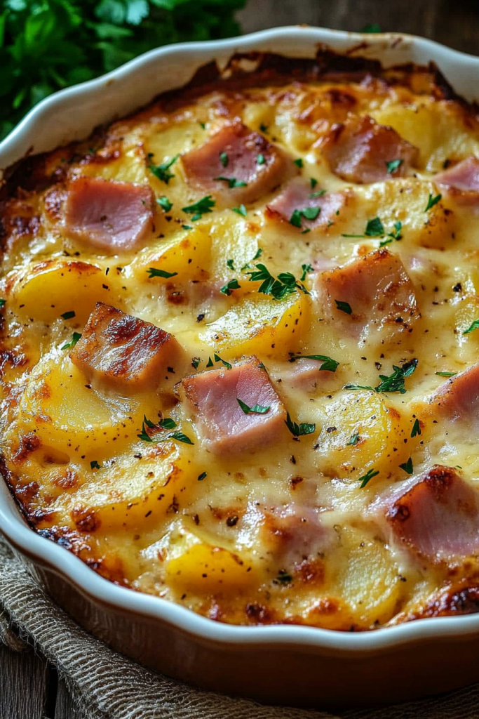 There’s something magical about the combination of ham, potatoes, and creamy cheese. It’s like a warm hug on a chilly evening, a dish that feels like home no matter where you are. This Ham and Potato Au Gratin has quickly become one of my go-to comfort foods, and every time I make it, it brings back cherished memories of family gatherings and cozy nights in. Growing up, I vividly remember my mother’s kitchen always being filled with the scent of something baking—especially during the holidays. She had a way of turning humble ingredients into something extraordinary, and her potato dishes were always the star of the table. This recipe is inspired by her, but with a modern twist: tender slices of potatoes layered with savory ham, bathed in a creamy cheese sauce, and baked to golden perfection. It’s the kind of dish that makes you close your eyes after the first bite and say, “Wow, this tastes like love.” What I adore about this recipe is its versatility. It’s perfect as a hearty main course paired with a fresh green salad or served as a standout side dish during big celebrations like Easter or Christmas. The best part? It’s a wonderful way to use up leftover ham, which means nothing goes to waste. As the casserole bakes in the oven, the aroma fills the house, drawing everyone to the kitchen. When it’s finally time to serve, the bubbling, golden cheese on top gets everyone excited. And let’s not forget that moment when you scoop into the layers—potatoes soft enough to cut with a fork, smoky ham bits nestled between them, and that luscious, creamy sauce that ties it all together. Whether you’re making this for a special occasion or just a weeknight dinner, Ham and Potato Au Gratin is the kind of recipe that will quickly find a spot in your regular rotation. It’s a little bit nostalgic, a little bit indulgent, and 100% satisfying. So grab your apron and a casserole dish—you’re about to create something truly delicious!