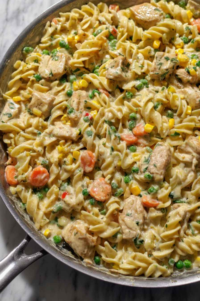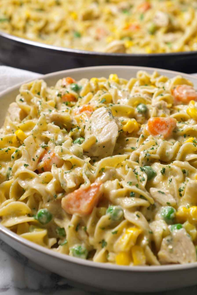 Step 5: Combine Noodles and Serve – Add the drained egg noodles (from Step 1) to the skillet with the creamy chicken and vegetable mixture. Stir well to combine, ensuring the noodles are fully coated in the sauce. Serve hot and enjoy!