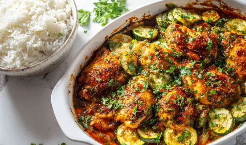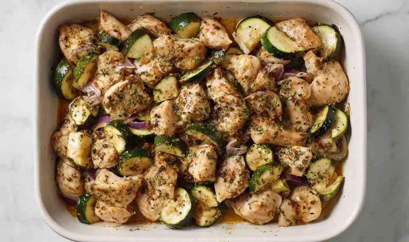 In a large mixing bowl, combine the bite-sized chicken pieces with diced zucchini and onion, tossing gently to distribute evenly. Drizzle the olive oil over the mixture, then add minced garlic, smoked paprika, cumin, oregano, salt, and pepper. Toss thoroughly until every piece is well-coated. For less excess moisture, optionally place the diced zucchini in a colander, sprinkle with ½ teaspoon salt, and let sit for 15 minutes. Pat dry with paper towels before combining with other ingredients. Transfer the seasoned mixture to your prepared baking dish, spreading it in a single layer. Don’t overcrowd or the vegetables will steam instead of getting those nice caramelized edges. Bake for 25-30 minutes, checking at 20 minutes – the chicken should reach 165°F internal temperature and the zucchini should be tender. For a more golden, caramelized finish (as shown in photos), switch oven to broil setting and broil for 2-3 minutes until edges are nicely browned. Watch carefully to prevent burning. Remove from oven and immediately sprinkle with fresh chopped herbs and an extra pinch of smoked paprika for color. Let rest for 3-4 minutes before serving over rice, which will help absorb the flavorful cooking juices.