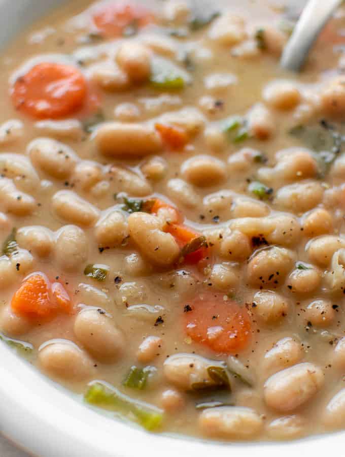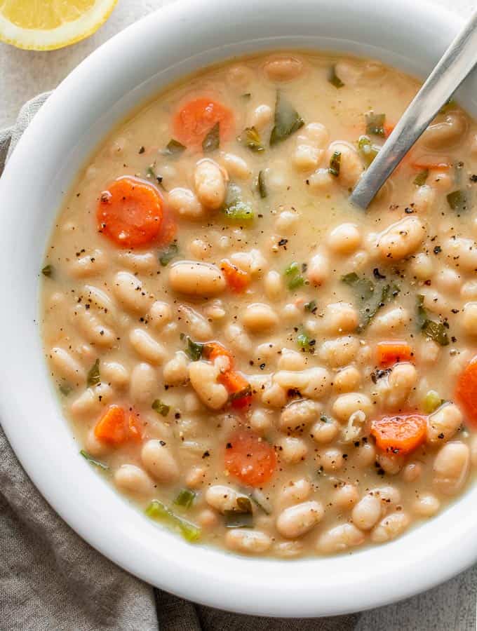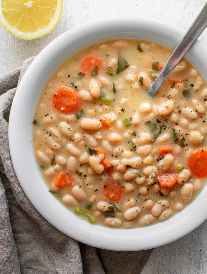 Can you think of a better winter comfort food than a white bean soup? Especially when its all made from scratch and therefore very nutritious as well. There are two traditional versions of Fasolatha (Greek White Bean Soup). The one is plainly cooked, flavored with lemon, like in this recipe, while the other version is made with tomato. Both are equally delicious and when it comes to deciding which one to make, I almost can never decide. But, there is one thing that I love about this lemony version of white bean soup. It’s so basic that you can add so many things to it. As it’s only made with onion, garlic, cannellini beans (or any other small white beans), carrot, celery, lemon zest + juice, and olive oil. So you can add anything like bacon, sausage, or my real favorite, almost any type of greens. Like spinach, (you can add kale, we don’t have it in Greece), or even wild greens.