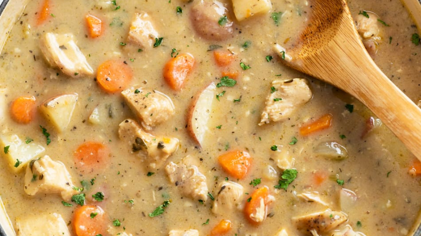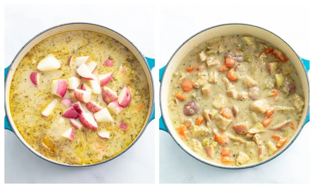 Use kitchen tongs to remove the chicken and set aside on a plate. Let it rest. Cut the potatoes into 3/4-inch chunks and add them to the stew Simmer until fork tender, about 20 minutes.