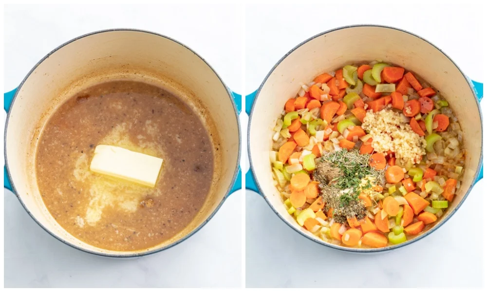 Add the butter and let it melt. Add the onions, carrots, and celery. Toss to coat. Soften for 5 minutes.