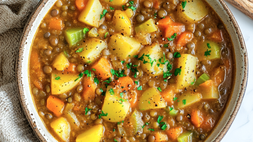 Add potatoes, lentils, broth, tomato paste, and thyme. Bring to a boil, then reduce heat and simmer for 20–25 minutes.