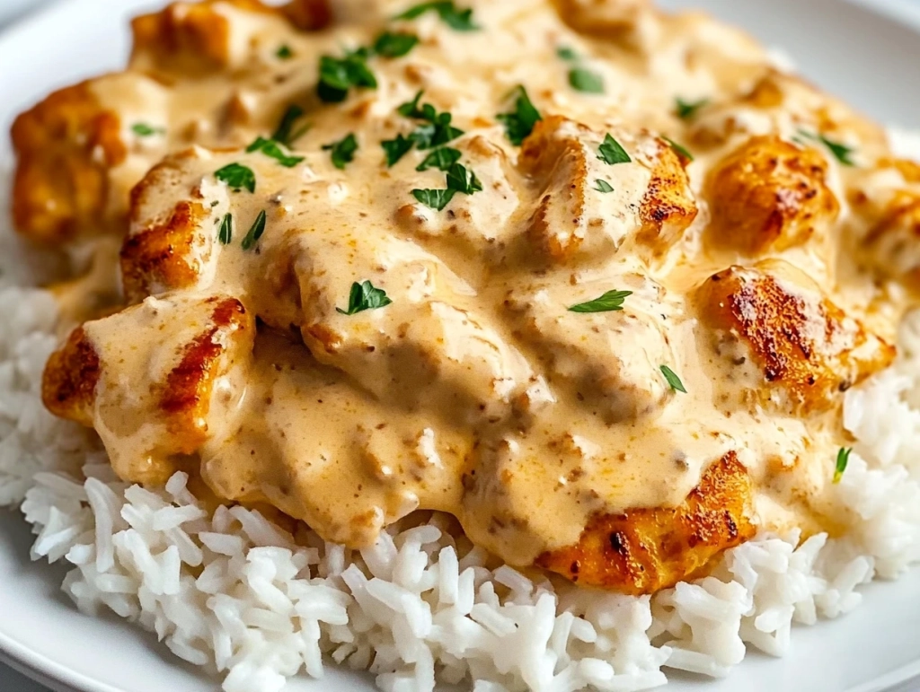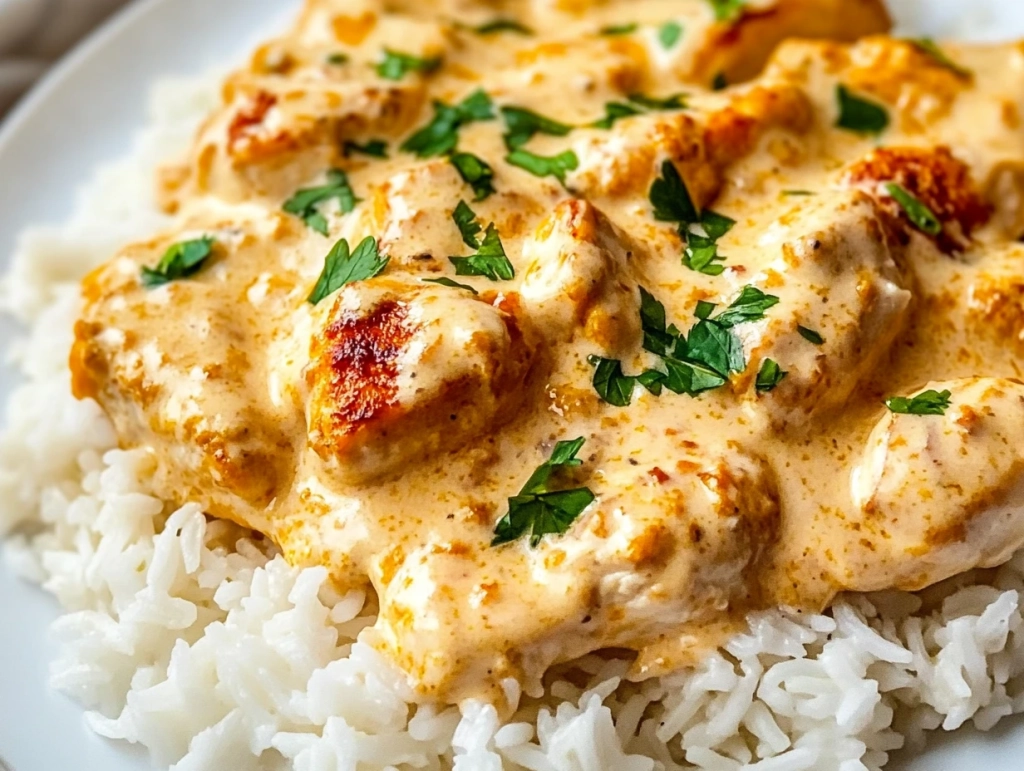 Assemble and serve: Plate the cooked rice and top with the smothered chicken and sauce. Garnish with fresh parsley and serve immediately.