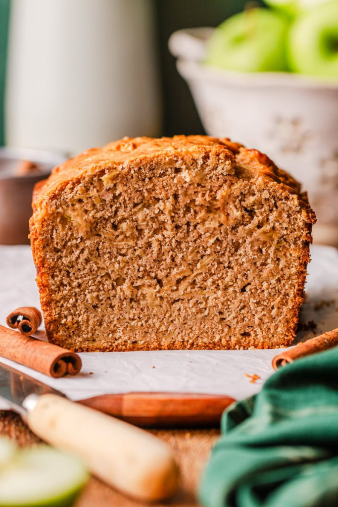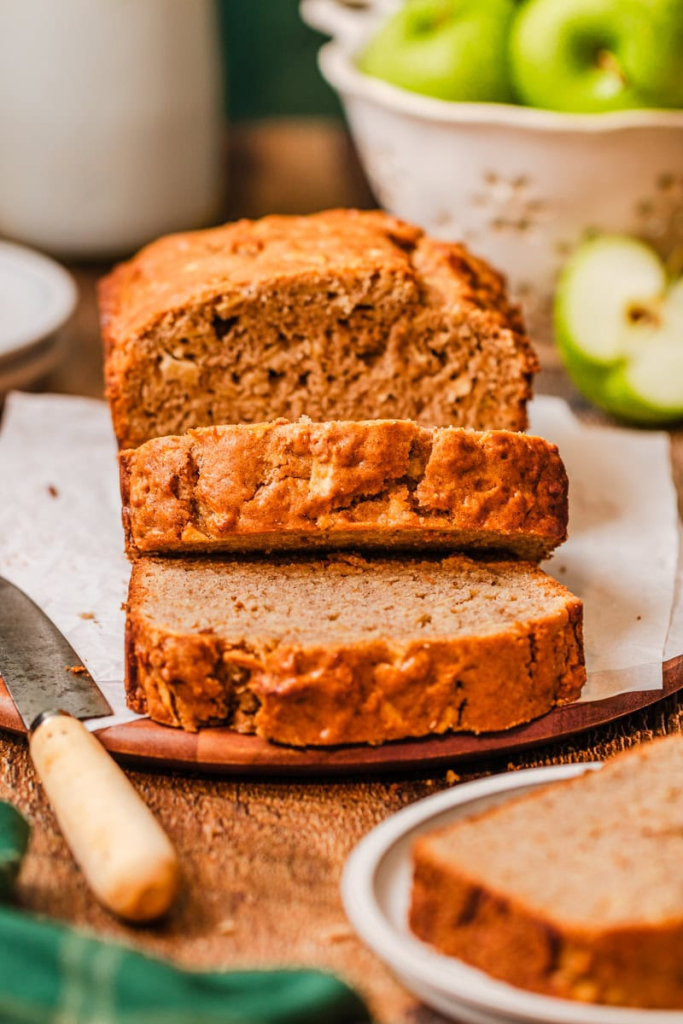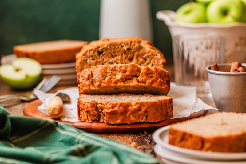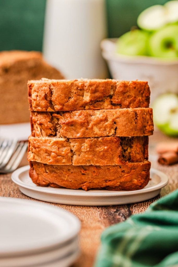 If you’re a fan of baked goods that are moist, flavorful, and bursting with the delicious essence of apples, then you’ll love this incredible Apple Bread recipe. This yummy quick bread combines the sweetness of juicy apples with warm spices, resulting in a loaf that is both comforting and irresistible. Whether you’re looking for a scrumptious breakfast option or a delightful afternoon snack, this apple bread is sure to satisfy your cravings and leave you wanting more. This simple recipe calls for ingredients you may already have on hand and is a treat that can be made any time of the year. I love to enjoy a few slices with my morning coffee, whereas my kids, love to enjoy theirs with some melted butter on top as a snack once home from school. Not only is this bread easy to make, but you can make it in a large loaf pan, mini loaf pans, or make into apple muffins. So many great options! Packed with chunks of apple and a slight spice flavor throughout, you can enjoy this anytime of the day!