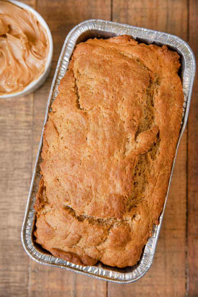 Preheat oven to 350 degrees and spray a 9×4 loaf pan with baking spray. Microwave the peanut butter on half power for 45 seconds to soften it, then in a large bowl whisk it together with the milk, brown sugar and egg until smooth. Sift together flour, baking powder and salt and add it to the wet ingredients. Whisk the dry and wet ingredients together until just combined then pour the batter into your loaf pan. Bake for 50-55 minutes or until a toothpick inserted in the center comes out clean.