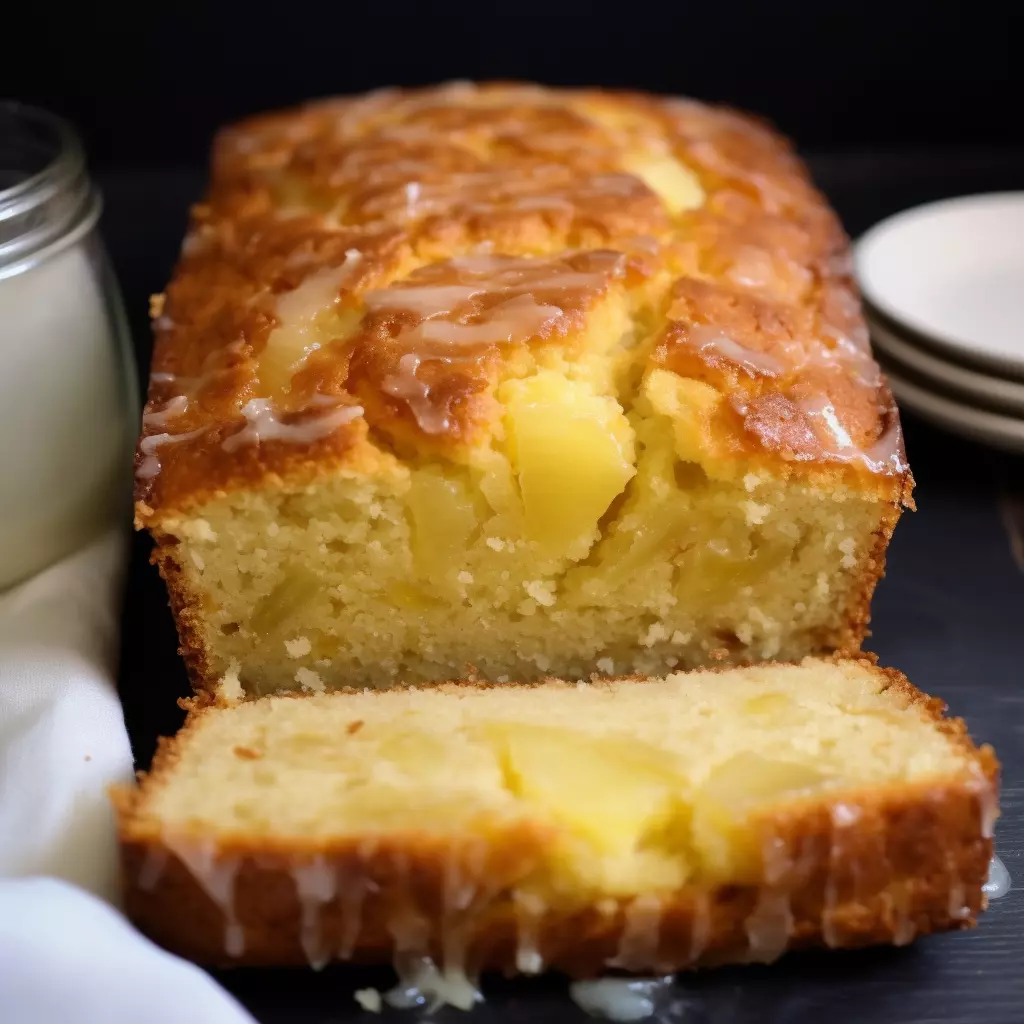 Transfer the batter to the prepared pan and spread evenly. Bake for approximately 55 minutes. Allow the bread to cool completely on a wire rack before removing from the pan. Prepare the glaze by mixing powdered sugar with pineapple juice, and then drizzle over the cooled bread.