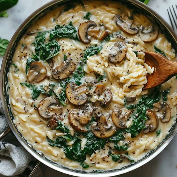 Mushroom and spinach orzo is not only delicious and comforting, but it’s also a nutritional powerhouse. You get the benefits of whole grains, antioxidants from mushrooms, and a boost of vitamins from spinach. Plus, it’s easy to customize based on your dietary preferences — whether you want to make it vegan, gluten-free, or even add other vegetables like zucchini or bell peppers. With its ease of preparation and versatility, this mushroom and spinach orzo recipe can quickly become a go-to in your kitchen. Whether you’re serving it as a weeknight meal or preparing it for a special occasion, it never fails to impress. It’s comfort food with a healthy twist! Mushroom and spinach orzo works beautifully as a standalone main dish, especially when you add a side of crusty bread or a light green salad. However, it can also function as a hearty side dish for larger meals, such as when paired with roasted vegetables or grilled tofu. For a full Italian-inspired meal, consider serving this orzo alongside a fresh caprese salad, bruschetta, or roasted vegetable antipasto. Its creamy, savory nature contrasts nicely with lighter, more acidic dishes. If you’re planning a more indulgent dinner, pairing this orzo with a glass of white wine, such as Chardonnay or Sauvignon Blanc, will complement the earthy flavors of the mushrooms.