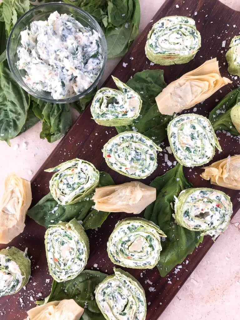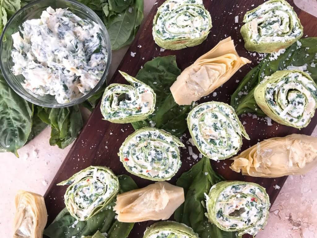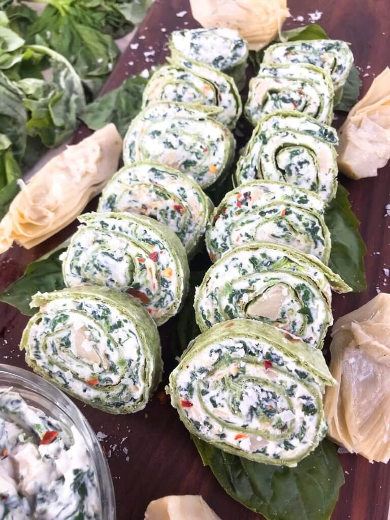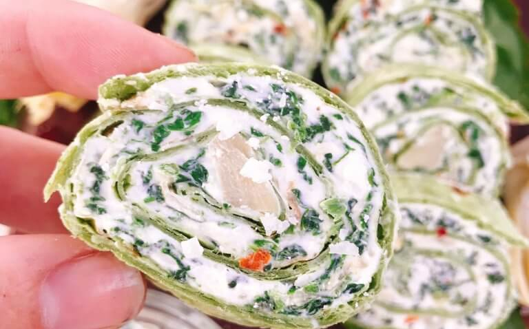 A: This pinwheel is made with tortillas, cream cheese, artichoke hearts, spinach, sour cream, parmesan cheese, red pepper flakes, garlic powder, and salt. The key component is the tortilla that fillings are wrapped inside of to make the pinwheel shape.
