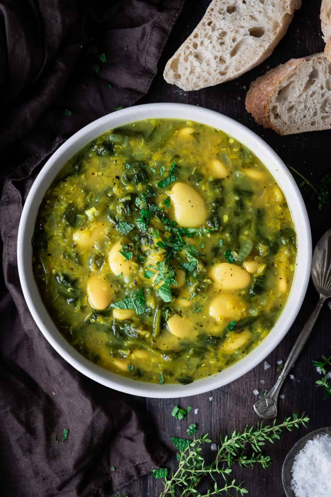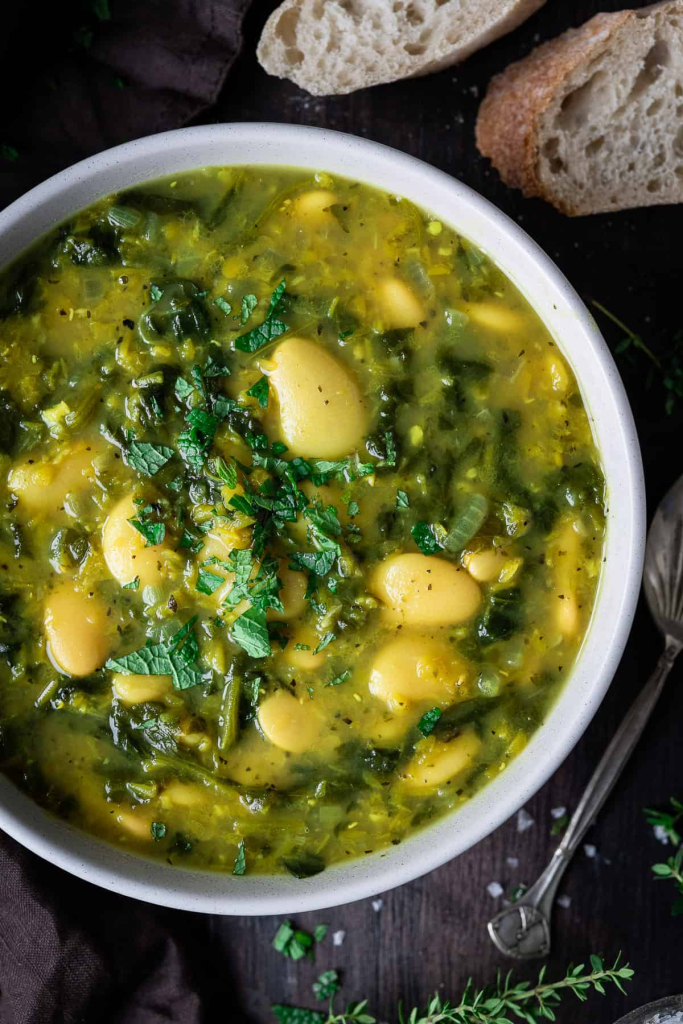 Spinach, lentil and butter bean soup – this easy vegan soup is healthy, hearty and nutritious. It is high in plant-based protein and makes a great filling lunch or light dinner. I make this spinach, lentil and butter bean soup frequently when the weather is cold. It is a lovely hearty soup, packed with red lentils and butter beans which make it filling as well as nutritious and a good source of protein. It is flavored with mint, thyme, turmeric and bay leaves which gives it a lovely fresh, herby flavor. It is even better the next day once the flavors have had a chance to develop!