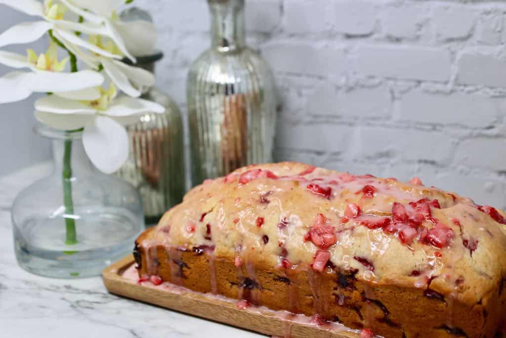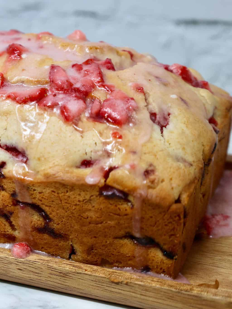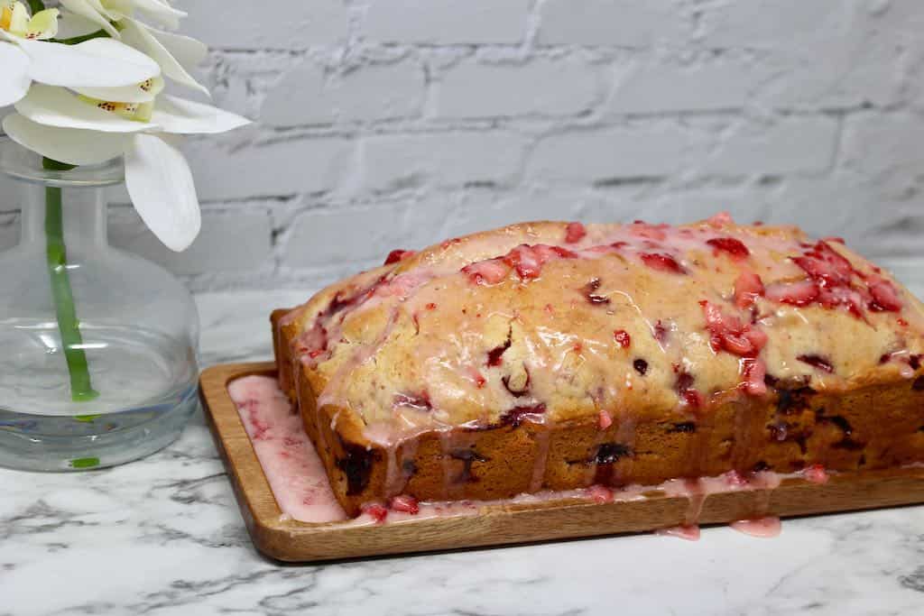 There are so many reasons I love this Glazed Strawberry Bread with its perfectly soft texture and that sweet strawberry glaze. I use simple ingredients to make this quick bread that does not have to rise. Real strawberries in both the bread and the glaze! Each time I make this bread, memories of summer desserts come flooding back. Each bite brings a sense of nostalgia, similar to when you enjoy a warm slice of homemade banana nut bread or a comforting blueberry muffin with cream cheese filling. Are you tired of the same old snack recipes and looking for something new to impress your friends and family? Look no further than Glazed Strawberry Bread! This mouth-watering treat is sweet, fruity, and easy to make, making it the perfect addition to any occasion. So, get ready to tantalize your taste buds and try out this new recipe that will become your favorite snack in no time. Strawberry Bread is an easy quick bread recipe, which means you do not have to let it rise. Quick Breads are made with baking powder or baking soda instead of yeast so they don’t have to rise or rest before baking. We love the flavor of this Strawberry Bread, especially when you add the luscious strawberry glaze to the top.