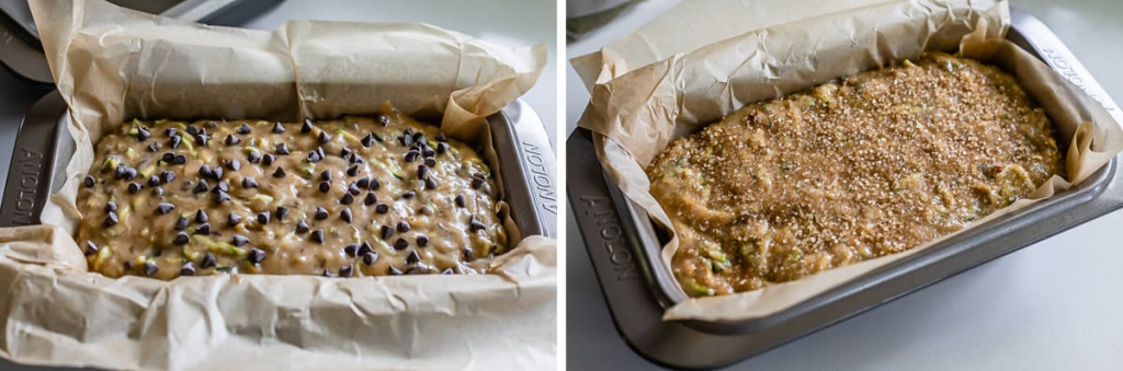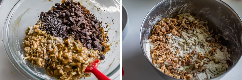 You need 12 ounces of zucchini. If you don’t have a scale, measure out 2 cups, making sure to pack it in so you get the full amount. Usually this is about 2 smallish-medium zucchini.* Blot/ Squeeze the zucchini. Once your zucchini is grated, take the time to blot it on a paper towel, or squeeze it out. I like to lay a few paper towels on the counter, spread out the zucchini, then top with another layer of paper towels and press it down until both paper towels are soaked. Blotting your zucchini will keep your bread from being gummy. If you skip this step, you are still going to get great zucchini bread. I prefer the texture when the zucchini is blotted or squeezed. Add the zucchini to the bowl of dry ingredients and stir together. Add the dry ingredients to the wet ingredients and mix only until just combined. If you plan to add (1 cup) chocolate chips* or (3/4 cup) nuts, add them to the batter before the flour is even all the way mixed in, see photos. Then stir together with a spatula with as few strokes as possible. Over mixing the batter will result in tough bread.