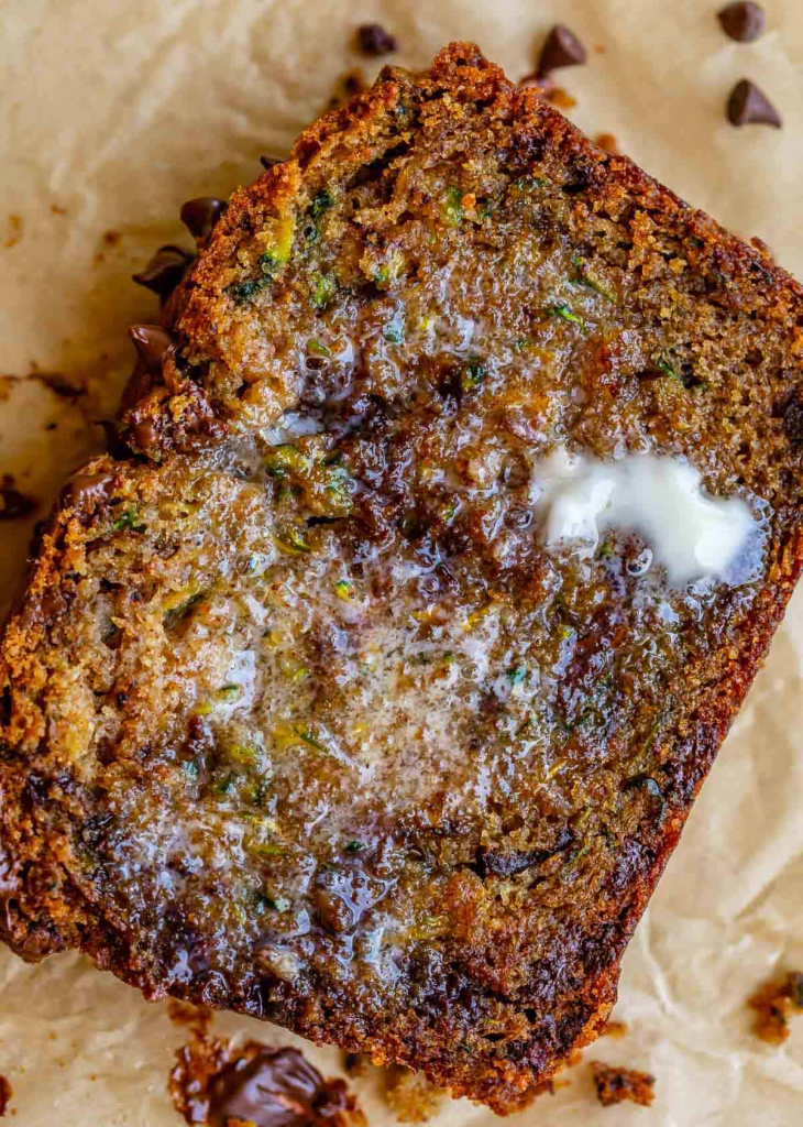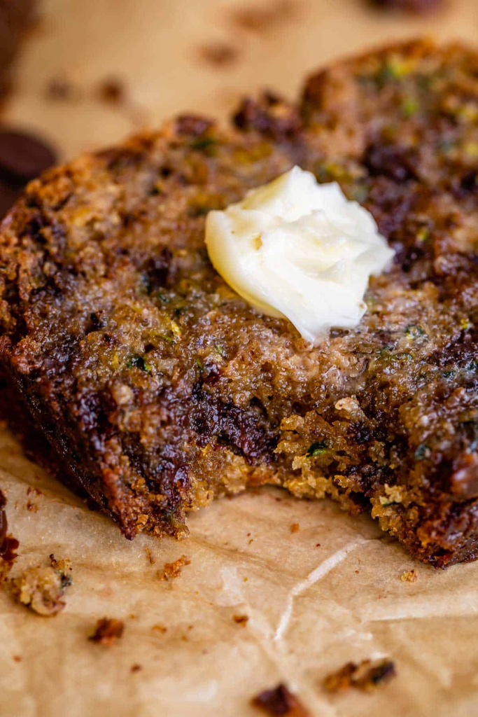 Freezer instructions: Make sure that your bread is completely cool, then wrap the entire loaf in plastic. Stick it in ziplock bag and store in the freezer for up to 3 months. Or to stash individual slices, wrap each cooled slice in plastic wrap, and store them all in a large ziplock. Let thaw (still wrapped) at room temperature on the counter. If you are in a hurry you can try heating it up in the microwave at a lower power level, or using the defrost button. Once thaw, we love to toast individual slices of zucchini bread to get them nice and toasty on the edges. And then slather in butter of course.