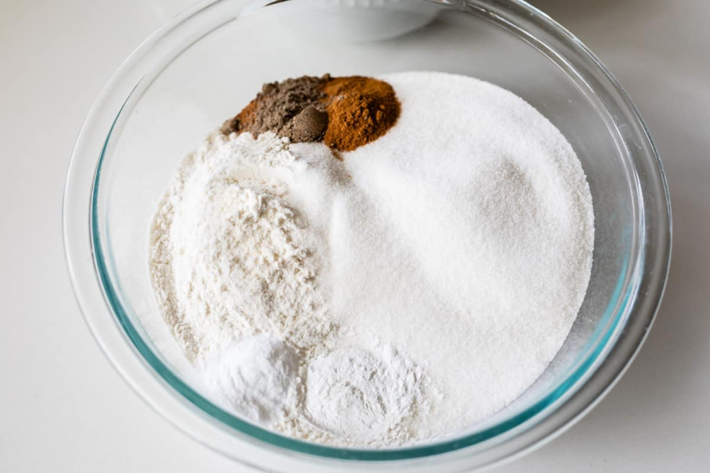Mix the dry ingredients. In a medium bowl combine the dry ingredients: 2 cups all purpose flour (spooned and leveled), 1 cup granulated sugar, 1 teaspoon baking soda, 1 teaspoon baking powder, 1 teaspoon kosher salt, 1 and 1/2 teaspoons cinnamon, 3/4 teaspoon nutmeg, and 1/4 teaspoon cardamom. Whisk together and set aside.
