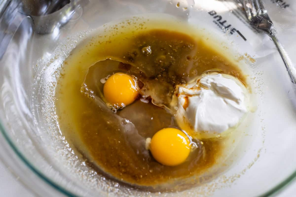Add 1/4 cup oil, 3/4 cup brown sugar*, 1/4 cup sour cream, 2 eggs, and 2 teaspoons vanilla. Whisk together until combined.