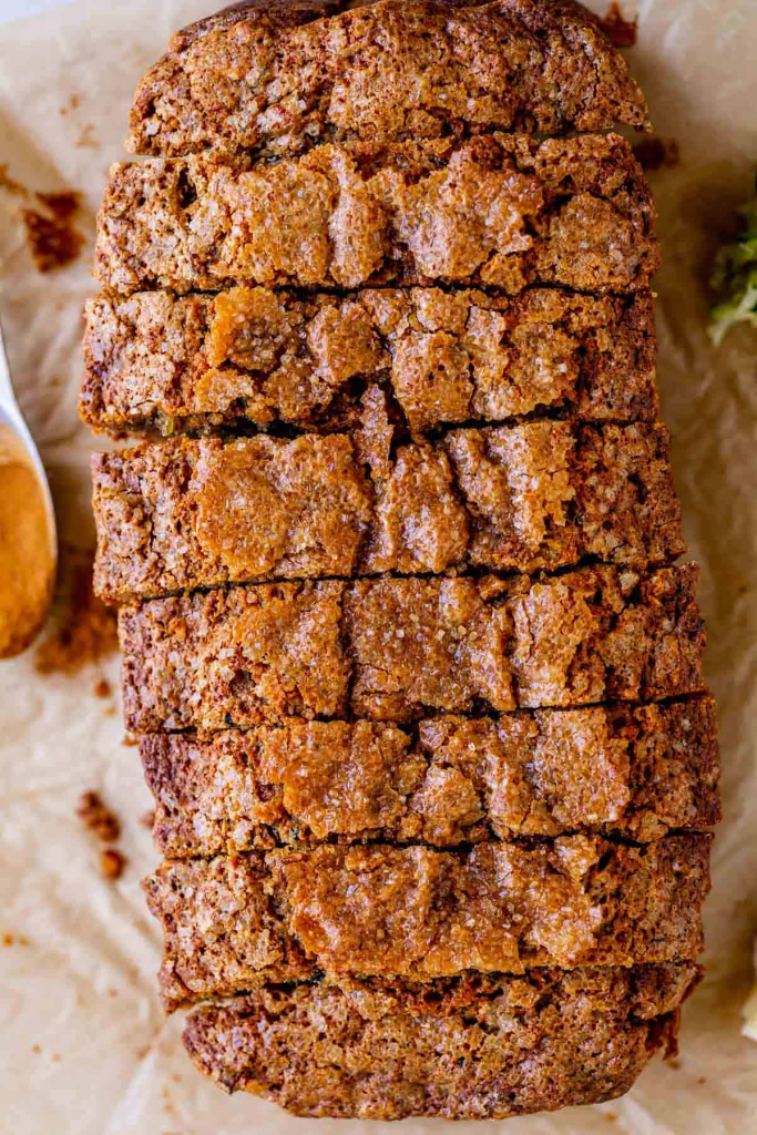 We all know the best part of zucchini bread is the crispy crackly top. The other 3 edges tend to get soggy pretty fast. The faster you take it out of the pan, the crispier your edges will be, but another trick is to cool bread on it’s side (on a cooling rack, once you’ve removed it from the pan). The bottom of the bread is the hottest part, and cooling on it’s side can help the bread cool down faster, resulting in crispier edges. This can also help prevent your bread from falling in the center (although you shouldn’t have a problem at all with today’s recipe.) Once the bread is completely cool (okay well, maybe not ALLL the way cool), use a sharp serrated knife and use a sawing motion to slice the bread.