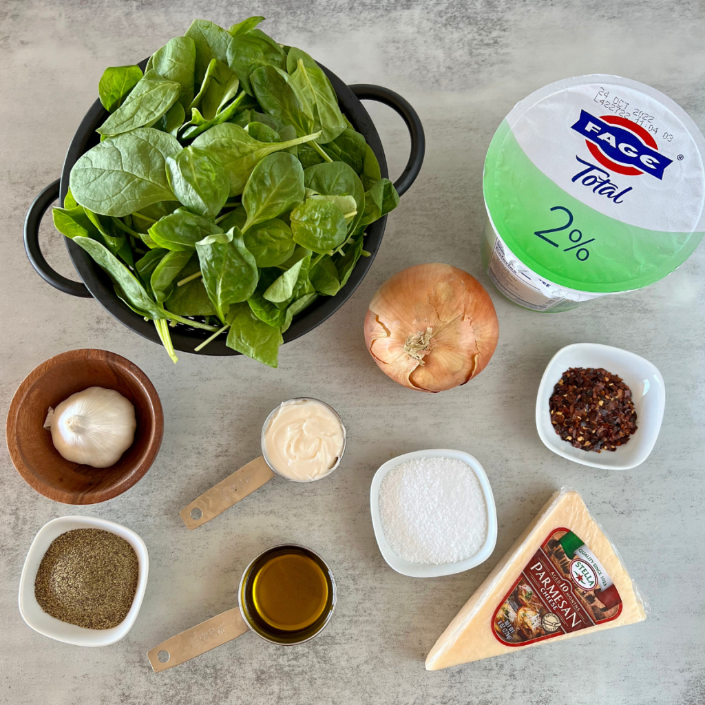 Preheat oven to 350 F. Finely chop fresh spinach, dice onion, and mince garlic. Grate parmesan and set aside for later. Heat oil in a large skillet over medium heat. Add diced onions and sauté for 3-5 minutes or until translucent. Stir in garlic and chopped spinach and cook for 3-5 minutes or until spinach wilts down. Meanwhile, in a separate bowl combine Greek yogurt, light mayo, 1/4 cup parmesan, 1/2 cup mozzarella, salt, pepper, and red pepper flakes (optional). Add Greek yogurt mixture to the pan and stir together. Cook for 1-2 minutes. Transfer to an oven safe baking dish (preferably the one you will serve out of). Top with 1/2 cup parmesan and 1/2 cup mozzarella, or more or less depending on your preference & the size of your dish. Place in preheated oven for 15-20 minutes. Broil for 2-3 minutes to get an extra bubbly golden brown top.