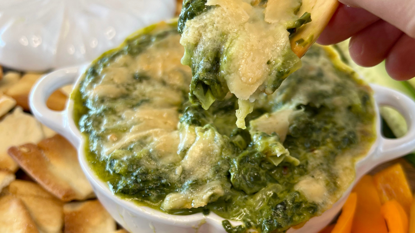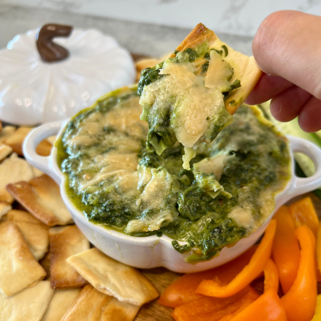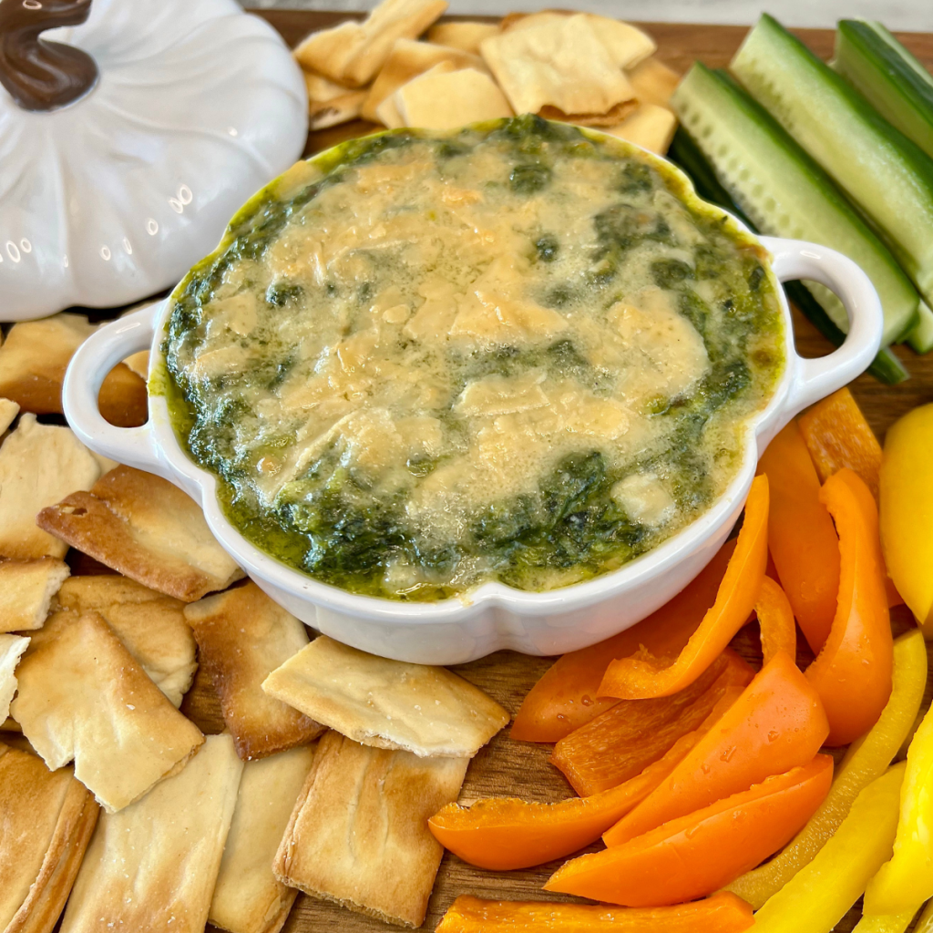 This delicious Greek Yogurt Spinach Dip is a creamy, easy, crowd pleasing appetizer that’s actually good for you. Thanks to the Greek yogurt this lighter and healthier version of spinach dip has less fat, more protein, and tons of vitamin A. It’s clearly the perfect game day snack that can be served hot or cold, with pita chips, tortilla chips, veggies, or toasted bread! One of the best things about Greek yogurt spinach dip is that it’s so versatile and can be enjoyed as a snack, appetizer, or used as a sandwich spread.