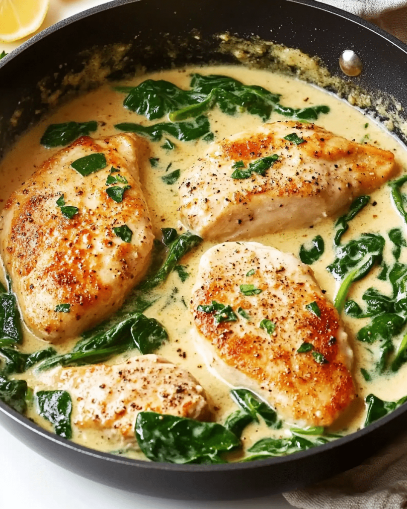 This creamy garlic skillet chicken with spinach offers a delectable balance of tender chicken, aromatic garlic, and rich creamy sauce. The spinach adds freshness, while the Parmesan cheese elevates the flavors for a comforting and satisfying meal. Perfect for a quick weeknight dinner or a weekend treat, this dish is sure to become a family favorite. The rich and creamy sauce paired with the succulent chicken offers an indulgent experience, making it ideal for serving over rice or pasta for a heartier meal. Skillet cooking is a beloved method for preparing quick, one-pan meals that are both easy to clean up and full of flavor. By using a single skillet, you can sear, simmer, and infuse ingredients with deep flavors without needing multiple pots and pans. This method is perfect for dishes like this creamy garlic chicken, where the chicken is first browned to develop a savory, caramelized crust, then finished in a luscious cream sauce. The skillet retains the fond—the flavorful browned bits left behind after cooking the chicken—which adds depth to the sauce and ensures that every component of the dish is infused with flavor. Garlic is a fundamental ingredient in many cuisines, known for its aromatic, slightly pungent flavor that mellows and sweetens when cooked. In this recipe, garlic serves as the aromatic base that enhances the cream sauce and adds complexity to the dish. Garlic pairs beautifully with chicken, infusing it with rich flavors that penetrate the meat. Spinach, on the other hand, adds a burst of color and freshness to the dish. When sautéed in the cream sauce, the spinach wilts and integrates into the sauce, giving it a vibrant green hue and a subtle earthiness that balances the richness of the cream. Not only does spinach contribute to the dish’s flavor, but it’s also a nutritional powerhouse. Packed with vitamins A and C, iron, and antioxidants, spinach adds both health benefits and visual appeal.