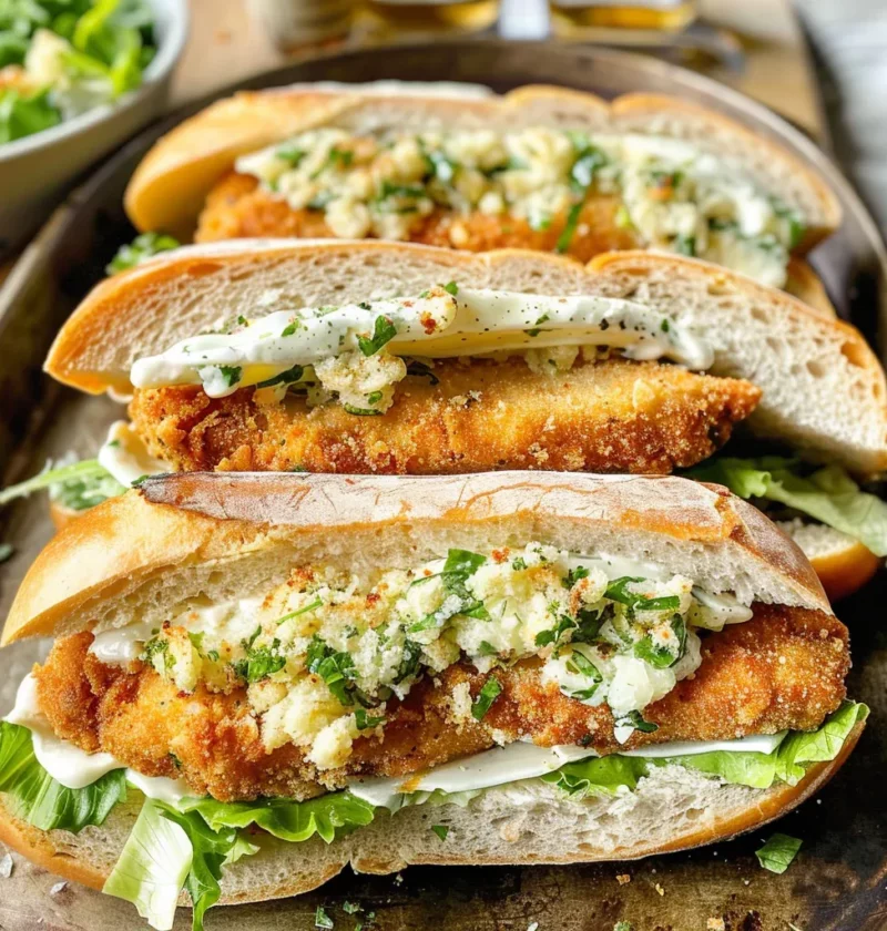 To start, prepare the chicken cutlets by slicing the chicken breasts in half or thirds horizontally, resulting in 4-6 thin cutlets. In a small bowl, whisk together the egg with a splash of milk, garlic powder, salt, and pepper. In another bowl, mix the breadcrumbs. Dip each chicken cutlet into the egg mixture, then coat with breadcrumbs, and fry them in a shallow pan filled with 1-inch deep vegetable oil over medium-high heat until they are golden brown and crispy, approximately 5 minutes. Once cooked, place the cutlets on a paper towel-lined pan to drain excess oil. Next, prepare the garlic butter by combining all the garlic butter ingredients in a small bowl. Slice the hoagies or baguette in half lengthwise, and spread the garlic butter mixture on the inside of each half. Toast them in a preheated oven at 450ºF or under a broiler for about 3-4 minutes until golden. In a separate bowl or mason jar, whisk together all the ingredients for the dressing. In a large salad bowl, toss the chopped romaine lettuce with 3-4 tablespoons of the dressing until well coated. When ready to assemble the sandwich, layer the crispy chicken cutlets on the toasted bread, add the salad on top, and finish with extra grating of parmesan cheese. Serve immediately and enjoy!