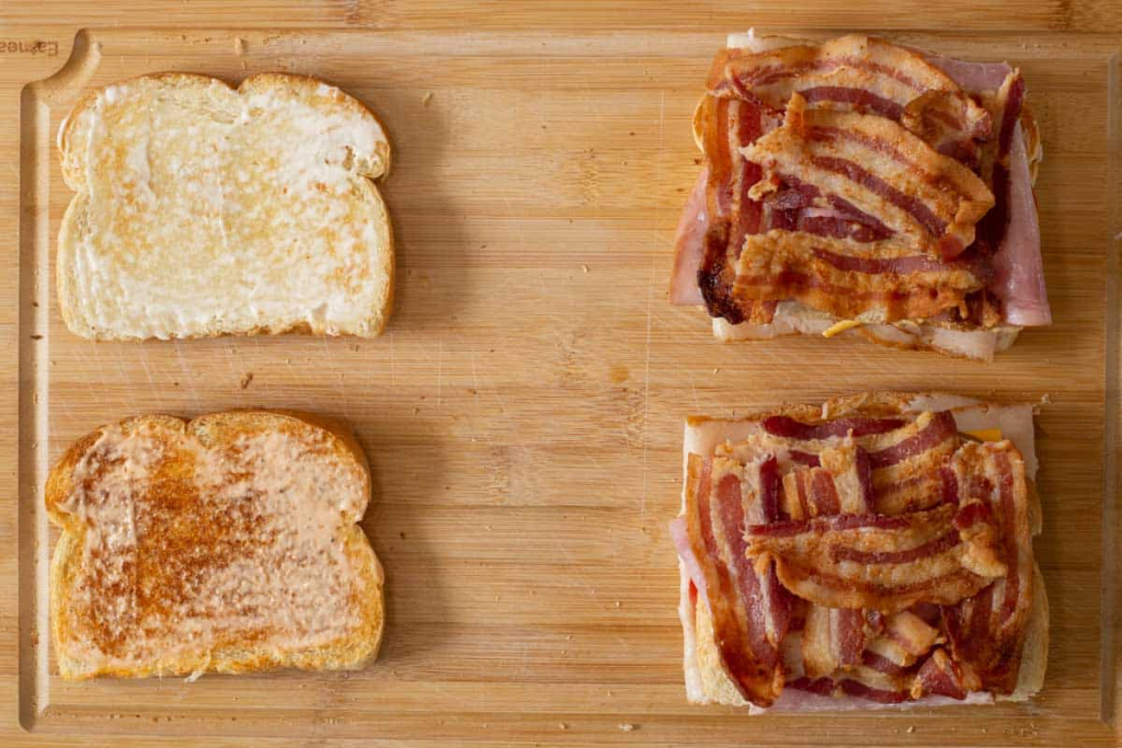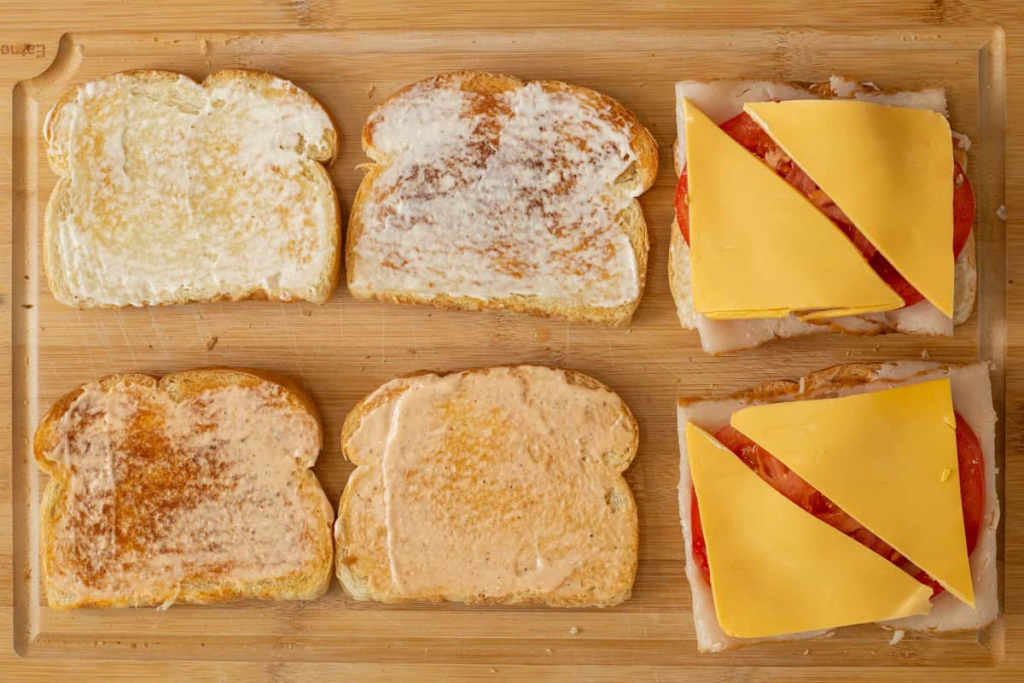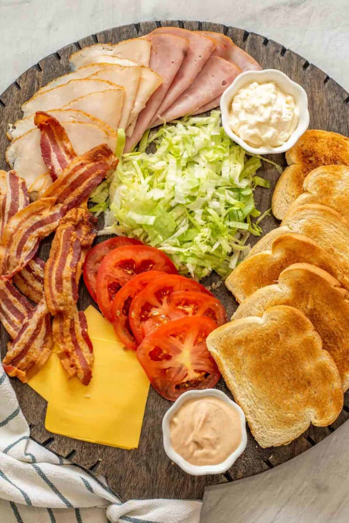 If you are looking for an easy-to-make meal, this easy club sandwich recipe is a must-try! The deli-style sandwich is layered with two tiers of meat, cheese, and a variety of crisp vegetables. Whether you’re making lunch or a quick dinner for the family, lunch for work, or a weekend picnic, this gourmet sandwich will satisfy your cravings. This club sandwich is packed high with layers of ham, turkey, bacon, and American cheese. What really sets this sandwich apart from a classic Italian sub is the three layers of toasted bread! This club sandwich recipe is the perfect stacked sandwich to make from scratch. Toasted sandwich bread, topped with a variety of deli meats and fresh vegetables. Not only is this sandwich delicious, but it also makes for a stunning presentation.