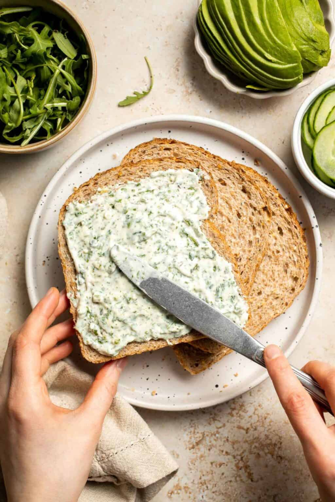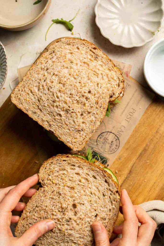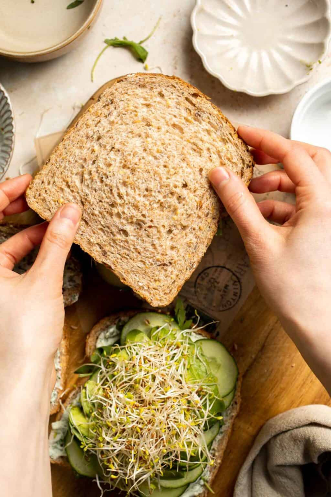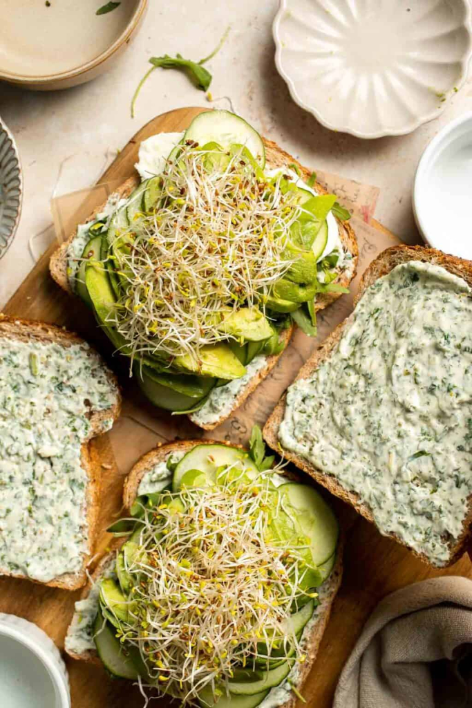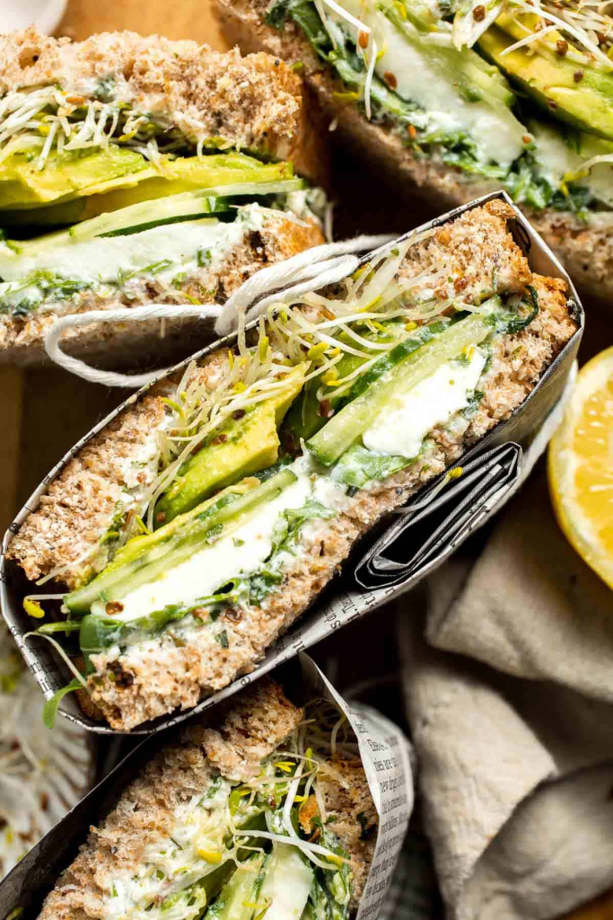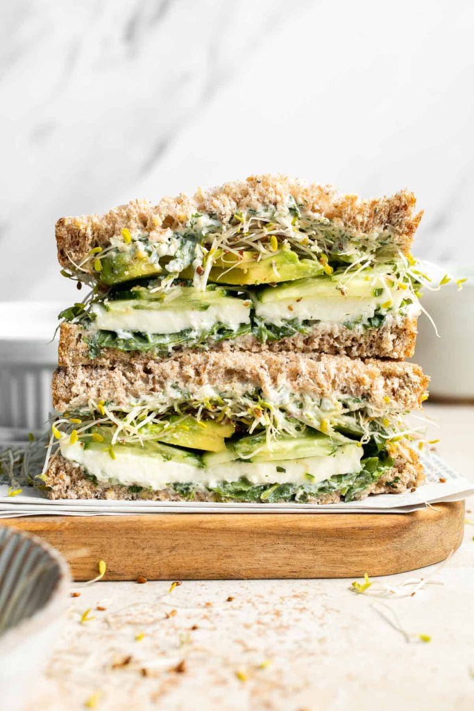 This Green Goddess Sandwich is a fresh and vibrant twist on a classic veggie sandwich. Creamy herb-packed sauce meets crisp veggies, creamy avocado, and mozzarella all layered between hearty slices of whole-wheat bread. Whether you’re looking for a quick lunch, a picnic favorite, or a refreshing no-cook dinner, this fancy cucumber sandwich delivers big on taste and feel-good fuel. Green Goddess Sandwich is a fresh and vibrant twist on a classic veggie sandwich, packed with a creamy herb sauce, crisp veggies, avocado, and mozzarella. What sets this sandwich apart is the bold, herbaceous green goddess sauce – it’s creamy, zesty, and full of fresh flavor that ties everything together. The mix of crunchy and creamy textures in each bite makes it especially satisfying. Plus, it’s easy to customize and quick to prepare, making it a go-to for both busy weekdays and lazy weekend lunches. If you are craving a veggie-packed meal with tons of flavor but without any complicated prep, then this is for you!