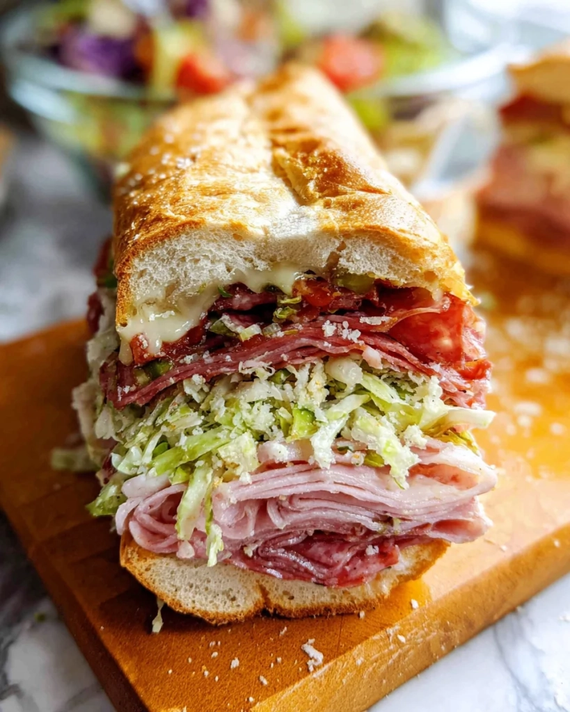 This Italian Grinder Salad Sandwich is a crowd-pleaser for any occasion. Whether you’re hosting a casual get-together, enjoying a picnic, or just craving a hearty meal, this sandwich delivers on flavor and satisfaction. With its layers of savory meats and creamy salad topping, it stands out as an irresistible choice that will impress family and friends alike. The Italian Grinder Salad Sandwich is not only delicious but also versatile. Its combination of fresh ingredients and bold flavors makes it perfect for any occasion. Feel free to customize it with your favorite toppings or sides. Indulge in the deliciousness of the Italian Grinder Salad Sandwich, a recipe that combines savory Italian meats, creamy salad, and fresh veggies for a flavor-packed meal. Perfect for any occasion—whether you’re hosting a casual gathering, enjoying a picnic, or simply craving a satisfying sandwich—this Italian sub is quick to make and easy to customize. With layers of salami, pepperoni, turkey, and provolone cheese topped with a tangy grinder salad, each bite offers an explosion of taste. Get ready to impress your friends and family with this hearty and wholesome dish that’s sure to become a favorite! Give it a try; you won’t be disappointed!