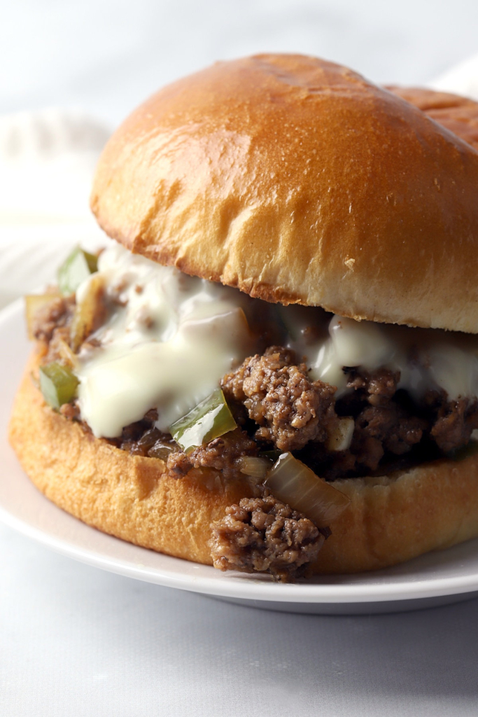 Cheesesteak style sloppy joes are packed with flavors reminiscent of a cheesesteak sandwich. Made with ground beef, these quick and easy sloppy joes sandwiches are filled with bell pepper and onion, then topped with melty cheese.