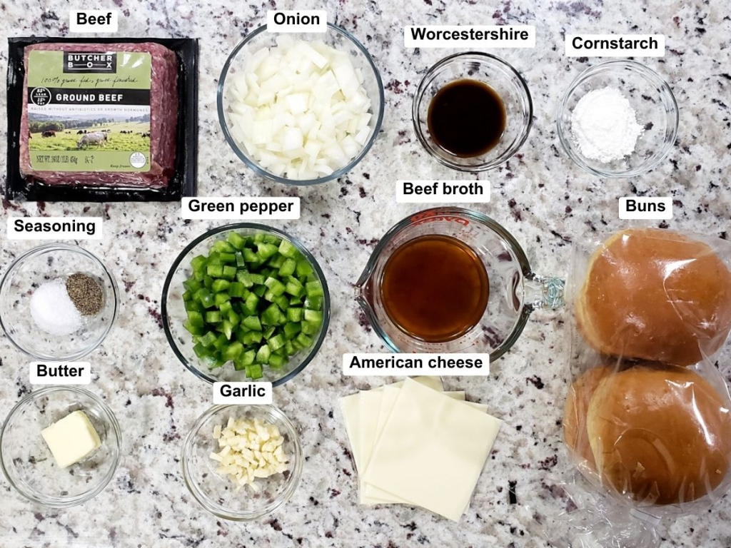 Heat a sauté pan over medium heat. Crumble ground beef and season with salt and pepper, then cook until browned, about 5 minutes. Remove from pan and set aside. If there’s excess grease in the pan, drain it out at this time. Add butter to pan. Once melted, add onion and bell pepper and sauté until vegetables begin to brown and onions turn translucent, about 4-5 minutes. Reduce heat to low, then return ground beef to pan. Add garlic powder, Worcestershire sauce, and beef broth, scraping the bottom of the pan as you incorporate your ingredients. Cook for about a minute. Add cornstarch and stir until dissolved, about a minute. This thickens the beef broth to create a sauce. If beef looks dry, add 1-2 tablespoons of water. Remove from heat. Top meat mixture with cheese slices and allow to set for 1-2 minutes, or until melted. Remove from heat, spoon onto rolls and serve immediately.