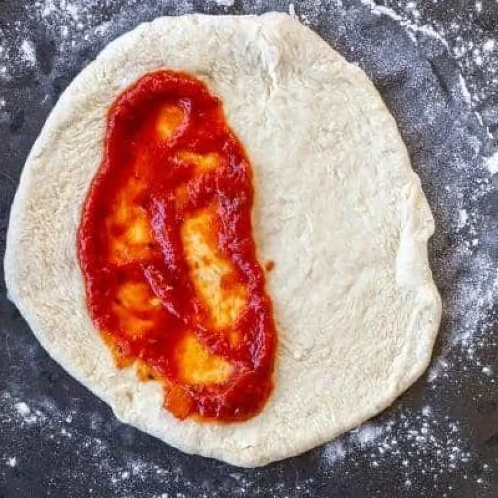 ➺ Leave the edges sauce-free. Make sure you leave space at the edge of each calzone for folding. If you spread sauce all the way to the side, it will make it hard to seal the calzone.