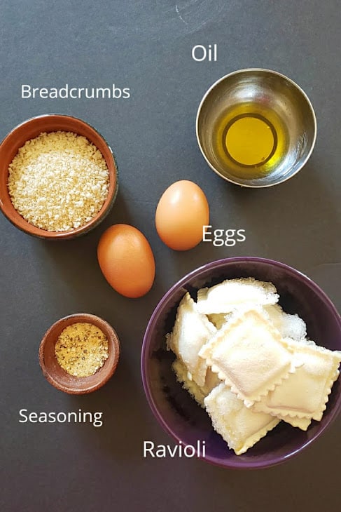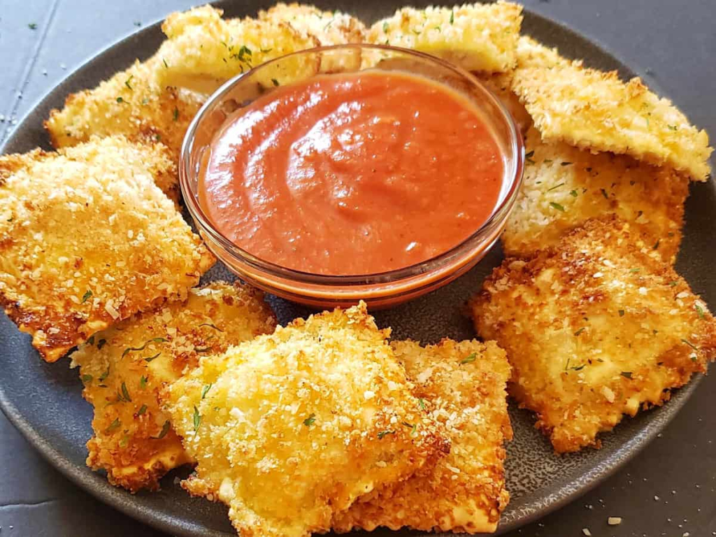 A: Toasted ravioli is an appetizer where fresh, or frozen ravioli are are dredged in seasoned breadcrumbs, then air fried to crispy golden brown.