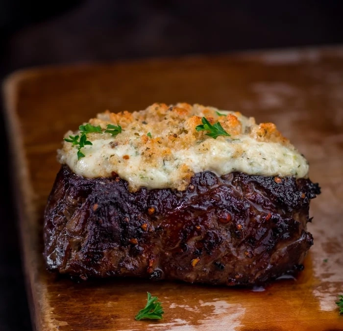 The process: You’ll season the steak and sear it on both side. Cook the steak slightly under your desired temperature. you’ll then whip together the topping, slap it on top then place it in the oven to broil for a few minutes to crisp up the breadcrumbs.