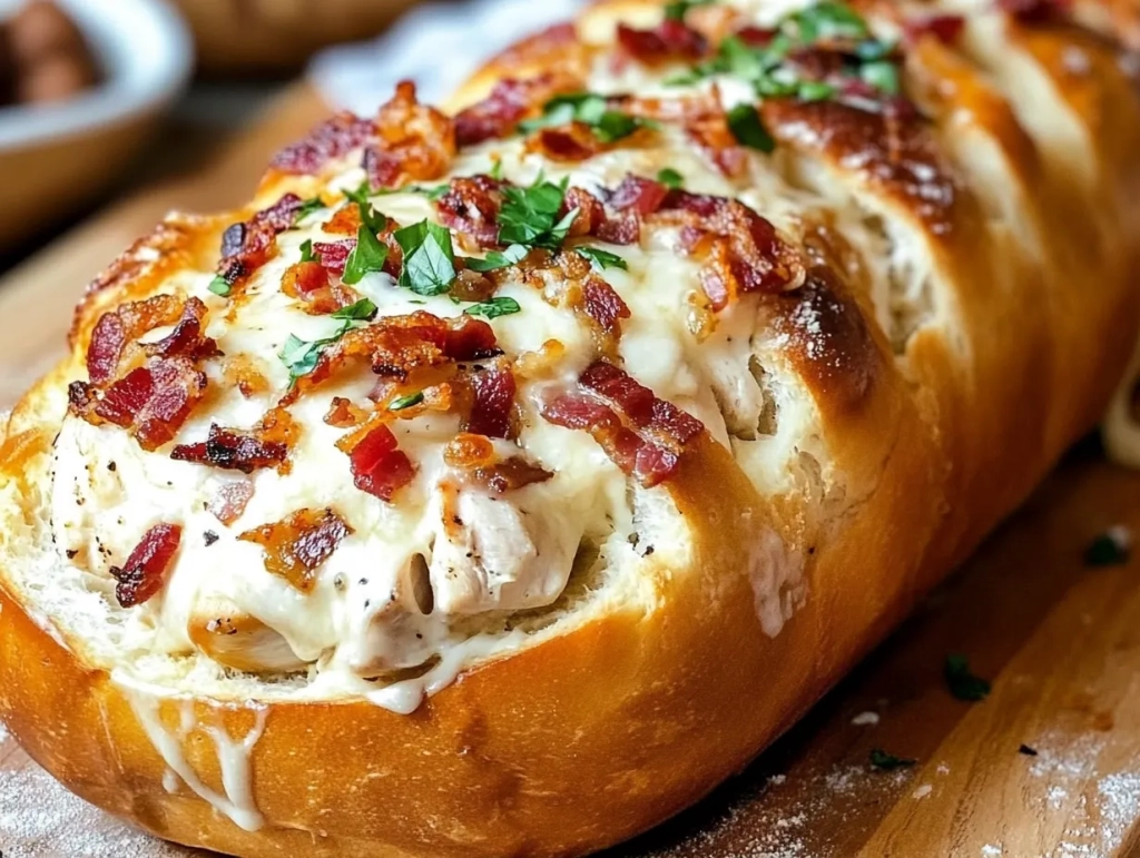 One of the best parts about this dish is its simplicity. With pre-cooked ingredients like rotisserie chicken and bottled ranch dressing, the prep work is minimal, allowing you to focus on assembly and baking. You’ll have a hot, cheesy, flavorful stuffed bread ready in no time, without needing to spend hours in the kitchen. This Chicken Bacon Ranch Stuffed Bread is a deliciously hearty recipe that combines savory rotisserie chicken, crispy bacon, creamy ranch dressing, and gooey Colby-Jack cheese, all baked inside a crusty Italian loaf.