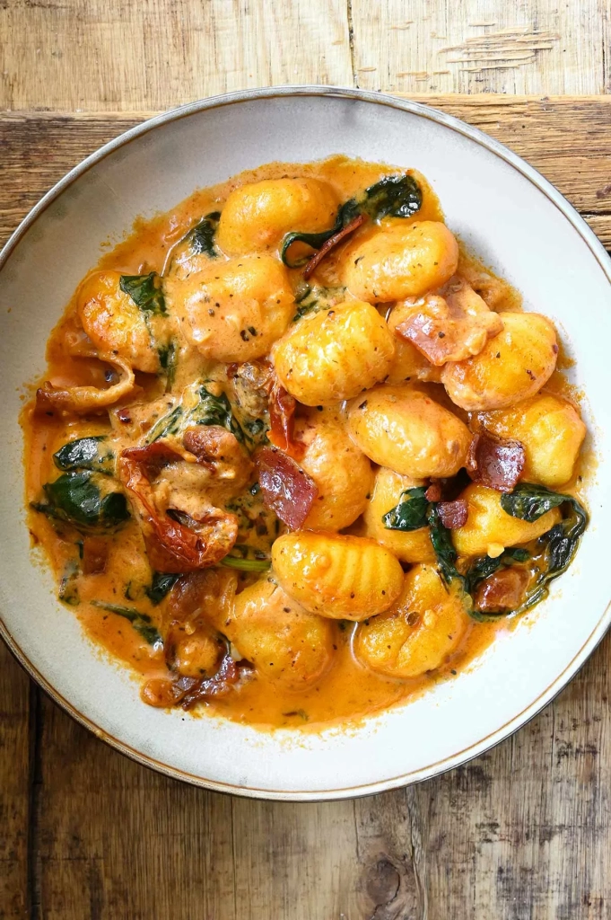 This one-pot Tuscan bacon gnocchi is the ultimate comfort food. It’s creamy, ready in 20 minutes and made with only just a few basic ingredients. Minimal effort, maximum comfort. Say hello to this creamy Tuscan gnocchi – a cozy, flavor-packed dish loaded with veggies and crispy bacon, all tossed in a luscious Tuscan-style cream sauce. It’s simple, satisfying, and perfect for busy weeknights. The one-pan cooking method is a total game-changer.