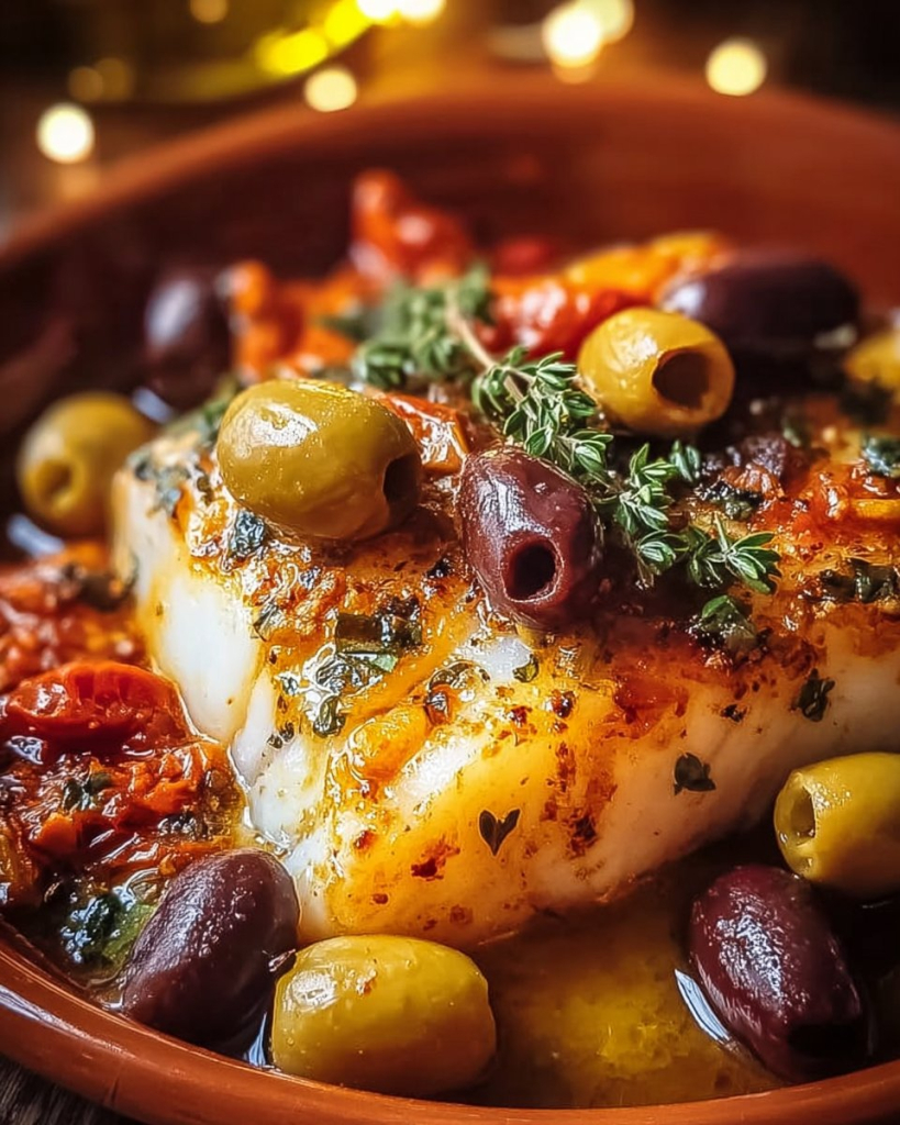 The origins of this dish are deeply rooted in the coastal areas of the Mediterranean, where fresh fish is a staple, and the flavors of olives, herbs, and citrus abound. The taste is both mild and savory, with the cod’s delicate flakes melting in your mouth, perfectly complemented by the salty richness of the olives and the sweetness of roasted tomatoes. The texture is a delightful contrast, with the fish being tender yet firm, while the accompanying vegetables soften and burst with flavor during baking.