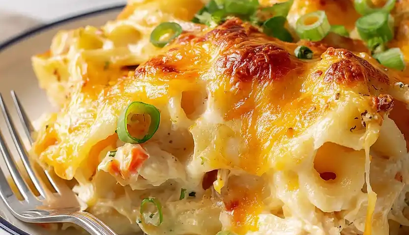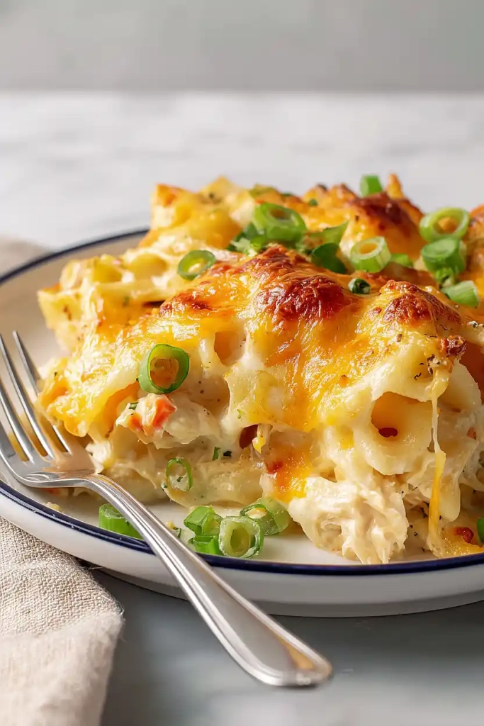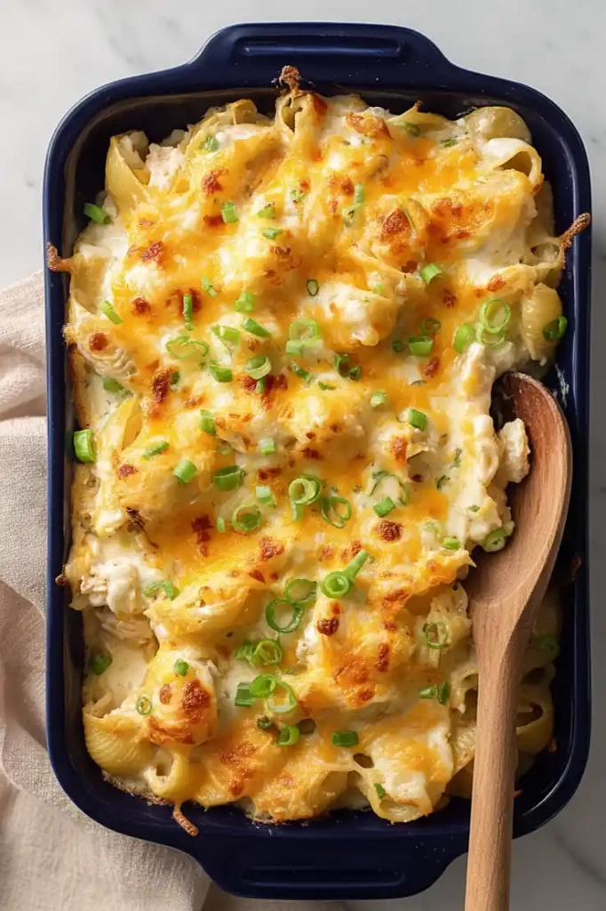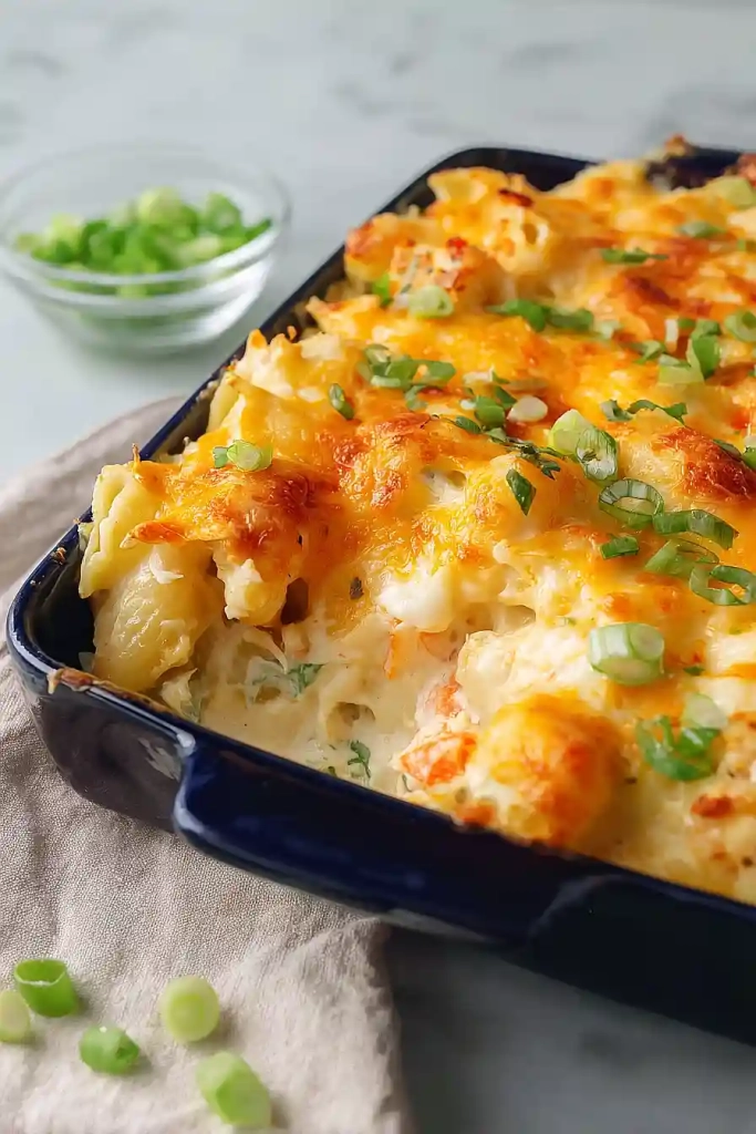 Step 5: Remove the bake from the oven and let it rest for 2-3 minutes. Top with fresh green onions for a bright, oniony finish that cuts through the richness of the cream and cheese. Serve immediately while hot and bubbly.