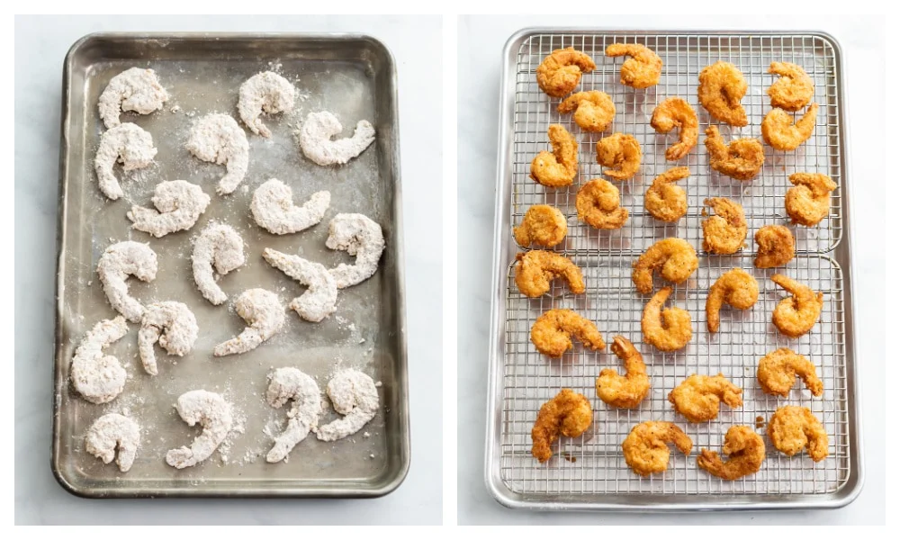 Set cooling racks over a baking sheet so that you can transfer the fried shrimp onto the racks. Allow excess oil to drip from the bottom. The air flow on all sides ensures the shrimp stays crispy.