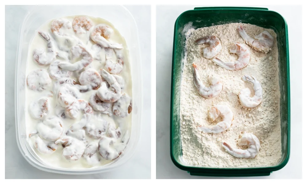 Just like the restaurants, we’ll soak the shrimp in buttermilk (or in this case, sour cream & milk as many people already have that on hand). This helps ensure that the breading sticks to the shrimp, leaving us with fully coated, crispy fried shrimp. The dipping options are endless, I love to serve it with lemon slices, freshly chopped parsley, and warm marinara. (Similar to how fried calamari is served!) I outline lots of dipping sauce options below, as well as pro tips, don’t miss those!