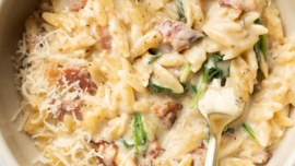 Prep time: 10 minutes Cook time: 20 minutes Total time: 30 minutes Servings: 6 Cuisine: Italian Recipe Info This one pot spinach bacon orzo...